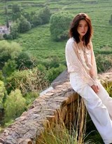 欧阳娜娜漫步于旅馆旁的小径,身着宽松的米色针织衫与长裙,背景是郁郁葱葱的树木,她仿佛是从森林故事中走出的精灵